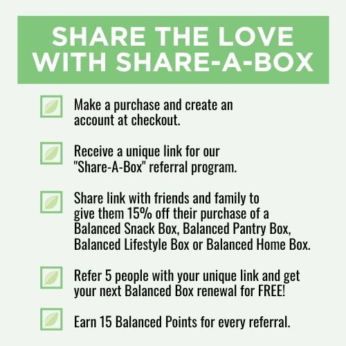For every 5 people you refer with your unique link, your next Balanced Box renewal is FREE! Plus, you'll earn 15 Balanced Points for every referral. And that's not all - the person making a purchase using your unique referral link will get 15% off their order of a Balanced Snack Box, Balanced Pantry Box, Balanced Lifestyle Box or Balanced Home Box! This discount is already programmed into your link and will automatically be applied at checkout for them.